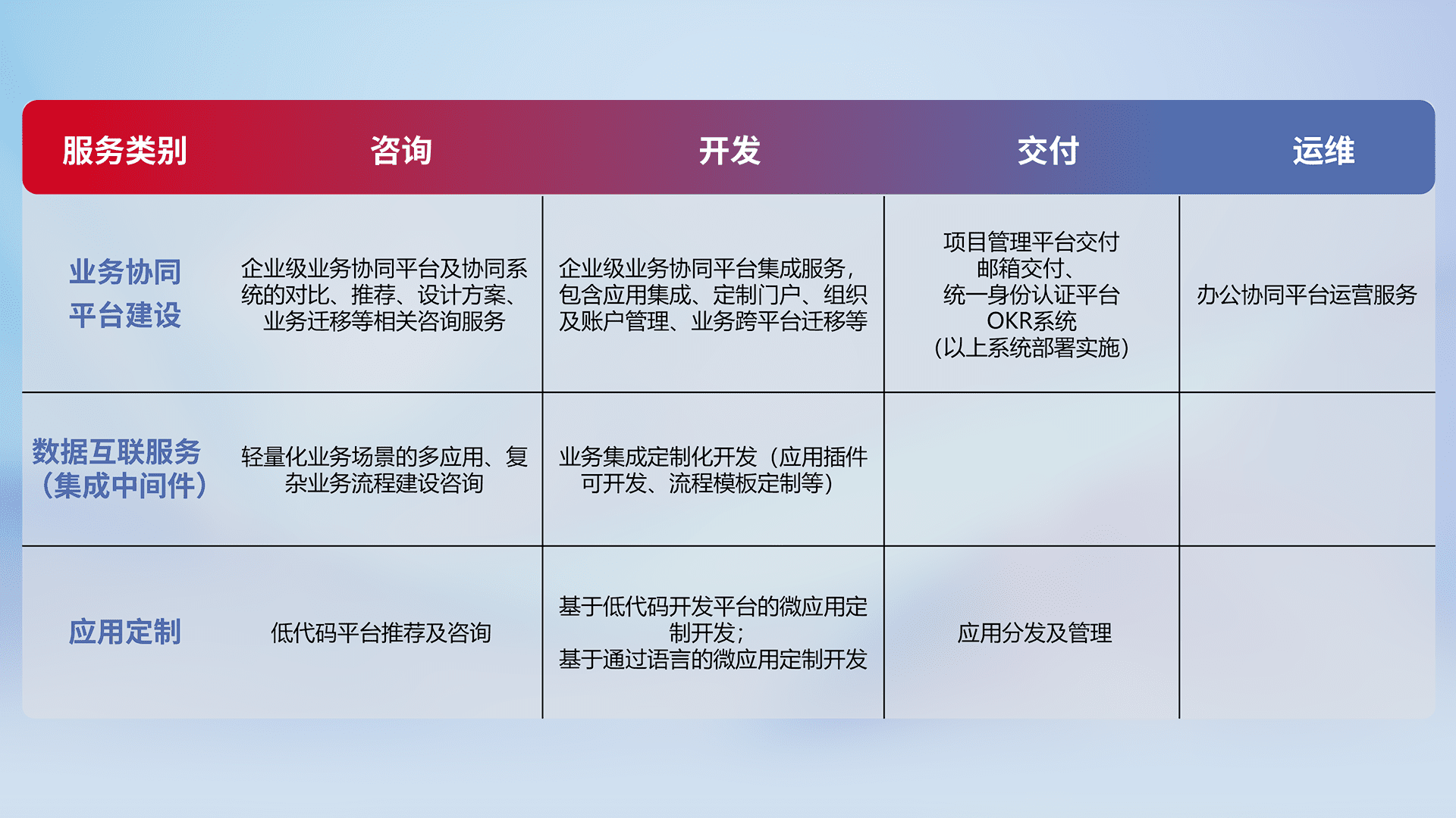 针对钉钉、、、、企微、、、、IDaas等平台级产品提供产品的规划、、、、方案、、、交付、、、、定制化开发等服务,,,,实现如统一协同办公、、智能客户服务、、混合会议管理、、、、智能数据查询、、、等业务场景,,,,实现数字化转型。。