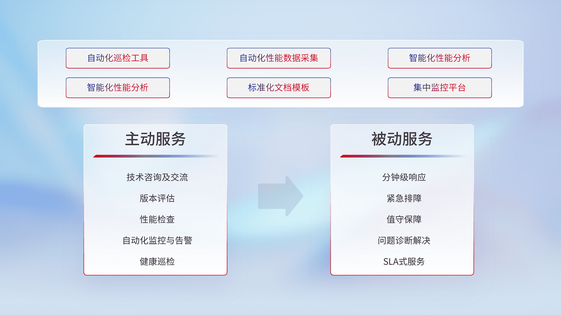 智能化工具和标准化文档,,,保障服务质量,,,提供主动服务(包含技术咨询、、、、版本评估、、、性能检查、、、、自动化监控与告警、、、健康巡检)和被动服务包含(分钟级响应、、、紧急排障、、、值守保障、、、、问题诊断解决、、SLA服务)。。。。